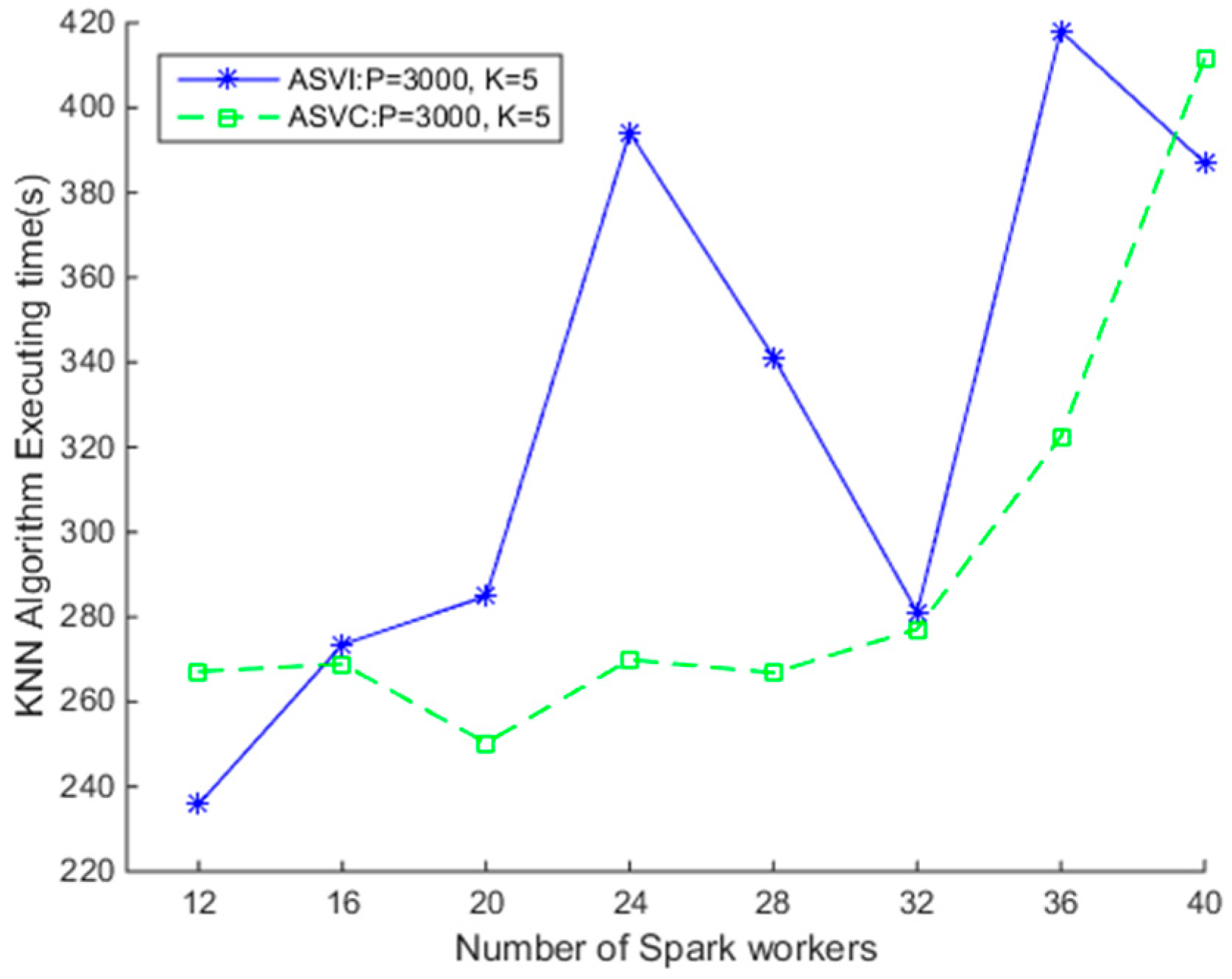 Assuming the clusters’ launching time is negligible, we first test the efficiency of the SNNQAs under the two clusters. Since it is necessary to specify the Ubuntu image in advance, the number of Spark workers running on each virtual instance is the same when using the ASVI. As shown in Figure 6, the efficiency of SNNQAs using the two auto-scaling strategies on the OpenStack cloud is very different. When p = 3000 and k = 5, there are 3000 grids on which to store spatial data objects, and each query object queries the five nearest spatial data objects in the grids. The average execution time is recorded when each SNNQA submission is executed 10 times with the total-executor-cores parameter set to six. We observe that increasing the number of Spark workers does not guarantee better efficiency of the algorithms. For example, when there are 12 Spark workers, the average execution time of the SNNQA using the ASVI strategy is 235.84 s. Doubling the number of Spark workers to 24 raises the average execution time of the SNNQA using the ASVI strategy (SNNQA-ASVI) to nearly 400 s, and when the number of Spark workers is increased to 32, the average execution time of the SNNQA-ASVI falls to 281.18 s. Then, when we increase the number of Spark workers to 36, the average time cost of the SNNQA-ASVI rises to 420 s. The high SNNQA-ASVI efficiency variability is possibly due to two factors; (1) the performance disturbance of the virtual instances and (2) the uncertainty of the number of Spark workers introduces SNNQA variations using the ASVI. We notice that Spark workers are quite often lost in the tests. Data-intensive computational tasks executed on each Spark worker require too many memory resources, which may disrupt the connection between the Spark workers and the Spark master instance. Further, there are no self-healing mechanisms for Spark workers in this context. When given fewer than 28 Docker containers to the algorithm, the execution time is always less than 270 s. As the results in Figure 6 show, when given 24 Docker containers, the average execution time is 269.91 s. When the number of Docker containers is limited to 20, the average execution time falls to 250.31 s. The time cost of the SNNQAs, using the two strategies, grows rapidly when the number of Spark workers is more than 32. These results indicate that the SNNQAs using the ASVC could be robust if the Docker container number is smaller than 32.