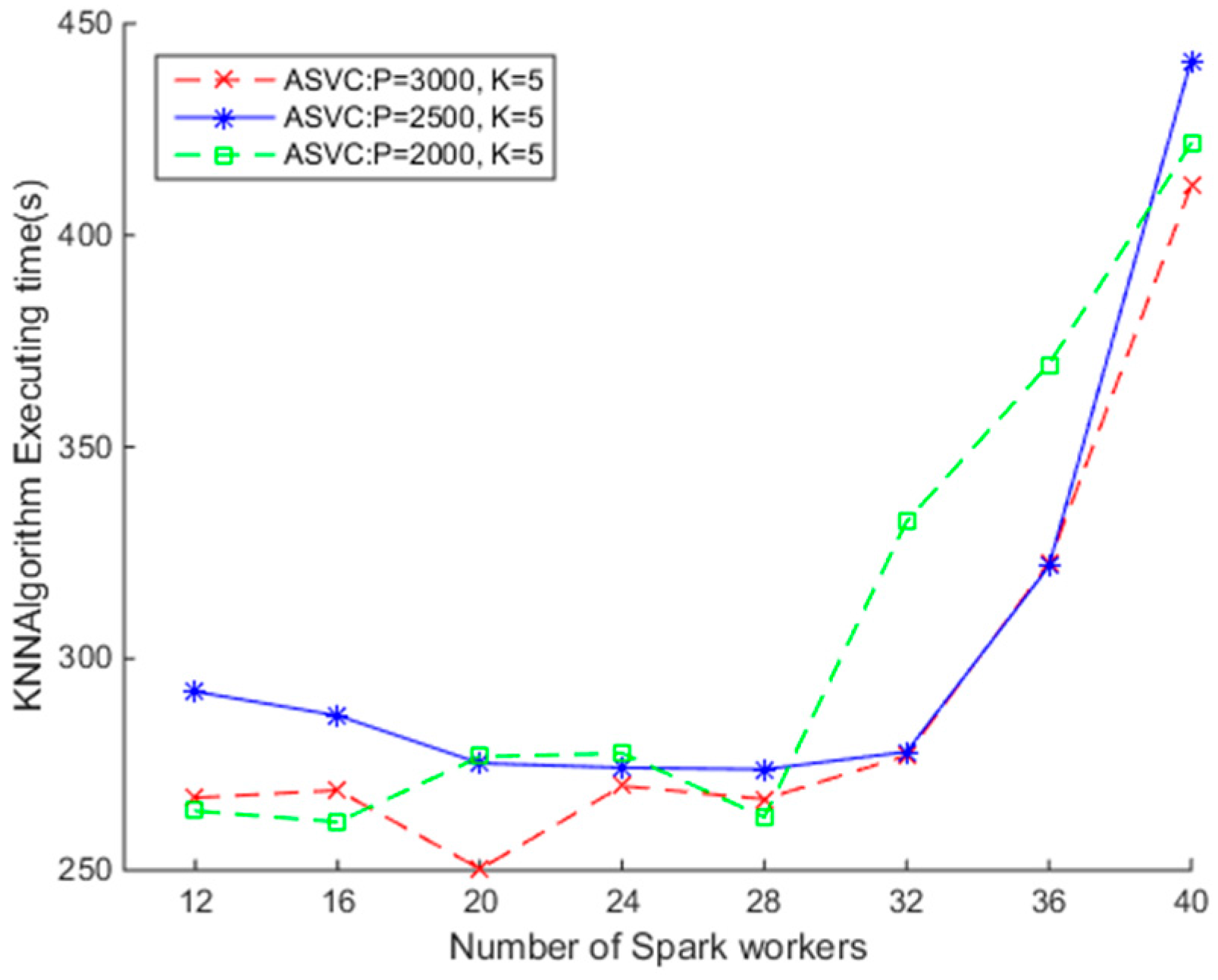 To understand how the parameter p impacts the efficiency of the SNNQAs, we conduct the third experiment as follows. Each submission of the SNNQA using the ASVC is executed 10 times with the total-executor-cores parameter set to six, and the average execution time is recorded. As shown in Figure 8, when there are fewer than 32 Docker containers relative to Spark workers, the SNNQAs complete in less than 300 s. When setting p = 3000, k = 5, and using 20 Docker containers, the average minimum execution time of the SNNQAs is about 250 s. When setting p = 2500, k = 5, and using 20 Docker containers, the average minimum execution time of the SNNQAs is about 270 s. When setting p = 2000, k = 5, and using 20 Docker containers, the average minimum execution time of the SNNQAs is about 271 s. We found that reducing the value of parameter p would increase the execution time of SNNQAs in this context. For example, when setting p = 1500, k = 5, and using 20 Docker containers, the average minimum execution time of the SNNQAs is about 330 s. When setting p = 1000, k = 5, and using 20 Docker containers, the average minimum execution time of the SNNQAs is about 437 s. The results testified that Spark is more suitable for handling small parallel tasks. As discussed earlier, the parameter p controls the number of parallel tasks at each stage of the Spark transformation chains. When the parameter p is small, the number of spatial objects processed by each Spark executor would be large, and the latency of the algorithms would thereafter increase. We do not explicitly state which configuration is best in this paper, but the curves of the average execution time of the SNNQAs using the ASVC exhibits great consistence when the Docker container number is fewer than 32. Our testing reveals that Spark workers running on the same host communicate with each other at low cost; therefore the performance of the SNNQAs is reliable. We observe that when more than 32 Docker containers are given to Spark workers, the execution cost of the SNNQAs increases, mainly because Kubernetes cannot sustain the required number of containers in the small CoreOS clusters.