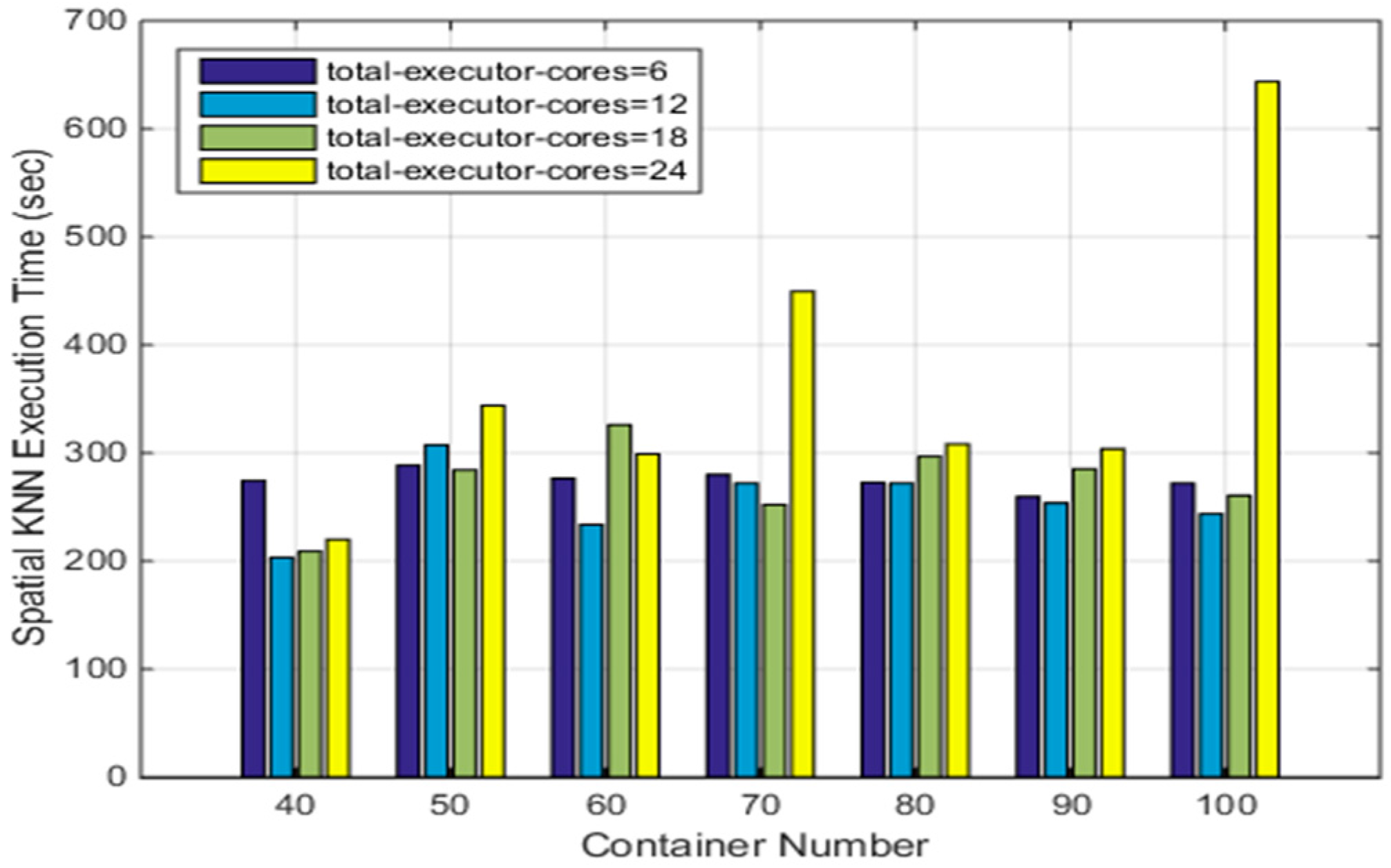 To investigate the effectiveness of the index to the SNNQAs, we conduct the second experiment as follows. When using the ASVI and 20 Spark workers, the Spark-based KNN algorithms using the Sort-Tile-Recursive tree (STRtree) index (SKNN-STRtree) completes in about 297.92 s, as shown in Figure 7. The Spark-based KNN algorithms without the STRtree index complete in about 284.89 s, as shown in Figure 6. These results indicate that using the index does not reduce the execution time of the SNNQAs using the ASVI strategies. The reason may be because the number of data objects in the grids is not large; therefore indexing in this context may not be necessary. The grid number determines the average number of objects that are processed by each Spark worker. When the grid number is small, the number of objects is large. Each Spark worker consumes more memory and increases the amount of time spent executing the spatial predicate calculation. When the grid number is large, the number of objects is small. When using the ASVC, the Spark-based K Nearest Neighbor (KNN) algorithms using the STRtree index complete in less than 300 s if working with 20 to 28 containers. These results indicate that the SNNQAs with the STRtree index using the ASVC could be robust if the container number is smaller than 28, and when giving more than 28 containers to the Spark workers, the costs of the SKNN-STRtree obviously increase. These results indicate that the CoreOS cluster may be too small for Kubernetes to auto-scale many containers. We also notice that the efficiency of the SKNN-STRtree varies when using the ASVI strategy. These similar results indicate that, regardless of whether or not indexing is used, the efficiency of the SNNQAs using the ASVI strategy is highly variable in clouds. The number of Spark worker daemons running on virtual instances varies. The Spark daemons residing on each virtual instance are prone to be out of service for many reasons. Data-intensive tasks consume lots of the memory of a Spark worker instance, which may lead to an ‘out of memory’ error. Additionally, networking in the cloud is typically unstable, and the networking between the Spark workers and the Spark master can sometimes be broken. We observe that the Spark worker daemons frequently fail during the tests. Therefore, we focus our remaining research, in this paper, exclusively on the ASVC strategies.