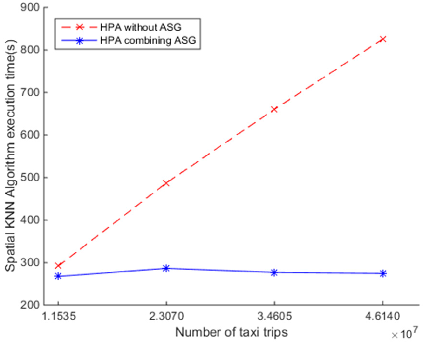 To investigate the efficiency of the SNNQAs using an HPA combined with an auto-scaling group, we conduct the seventh experiment as follows. First, a Heat template is used to depict the minimum, the desired, and the maximum number of CoreOS instances, which should be 5, 5, and 10, respectively. Each CoreOS instance has two VCPUs and 4 GB of RAM. Next, we force the auto-scaling group to scale out when the CPU utilization rate is above 80% and lasts about 1 min. Second, a Kubernetes template is used to depict the values of the minimum and maximum replicas of Spark workers, which should be 1 and 200, respectively. The TargetPercentage parameter is set to 80%. Finally, the SNNQAs are submitted to the auto-scaling group using the parameters: total-executor-cores = 18, p = 3000, and k = 5. Each submission of the SNNQAs is executed five times and the average execution time is recorded. As shown in Figure 10, increasing the number of query objects monotonically increases the execution time of the SNNQAs using the HPA exhibits when the auto-scaling group is not used. Finding the five nearest neighbors from 834,158 spatial data objects for each of the 34,604,649 query objects took approximately 660.64 s, while the execution time that uses the HPA combined with the auto-scaling group results in great performance. All of the runs complete in less than 300 s. The results show that the HPA combined with the auto-scaling group is beneficial for reliable spatial big data analysis. It is suggested that future research be directed toward automatically configuring these parameters.