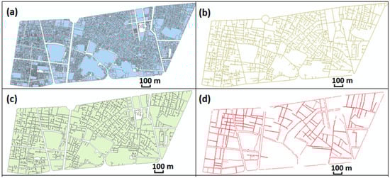 Urban layout of Tehran district 12: (a) parcels that have separate land use or ownership title; (b) paths; (c) blocks that are isolated by the paths surrounding them; and (d) edges.