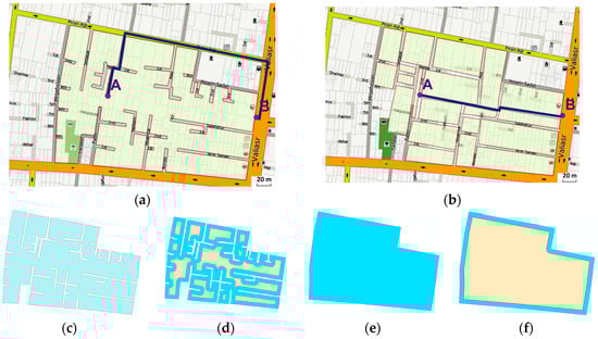 Legibility has been considered to be one of the main desirable qualities of navigation in urban environments [,]. The notion of legibility has been introduced by Lynch in a seminal work as the ease with which the parts of the city can be recognized and organized into a coherent pattern []. Bentley et al. categorizes the concept of a responsive urban environment via seven levels amongst them legibility and permeability []. Permeability is the property that denotes the ability to sense or move through a given environment []. It is largely influenced by the available paths and forms that emerge from a given urban space []. Overall, legibility and permeability provide key indices for evaluating urban navigation capabilities in the city [,,,,]. However, and despite the fact that these two concepts can be intuitively understood, their computational evaluation is far from being a straightforward task and has been hardly addressed in recent work.
