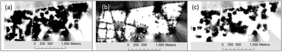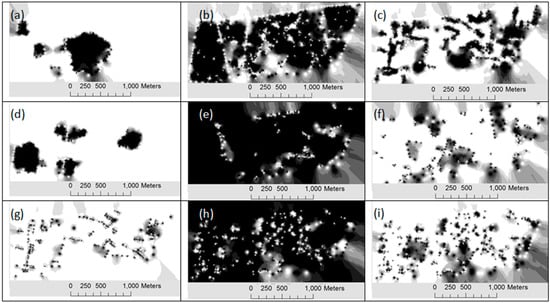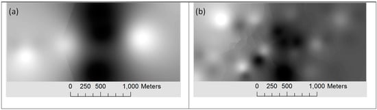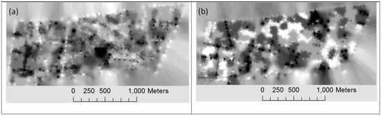 In the first experiment, a questionnaire complemented by instructions and definitions of the notions of legibility and permeability were distributed to a panel of 50 inhabitants who work, live or study in the selected area. The average age of the sample was 26 years with a sample deviation of 0.7. The panellists were familiar enough with the neighbourhoods and the selected points. A map of the studied area with the 9 neighbourhoods and 29 marked places accompanied by descriptions about their precise locations, and a table to fill the level of legibility and permeability, were given to the panellists (Appendix A). The questionnaires were answered by 50 panellists and the legibility and permeability notions have to be expressed in a range between 1 and 3 for high, moderate and less, respectively. The resulting opinions have been averaged in each neighbourhood and point and were used to derive a raster distribution of legibility and permeability for the extent as can be seen in Figure 9. The pixel values in Figure 9a,b are normalized by the unit interval, where darker pixels represent the more legible and permeable values, respectively.