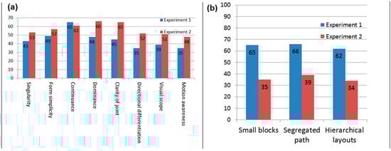 In order to compare the resulting map layers to the computational findings, the raster maps exhibited by Figure 5, Figure 6 and Figure 7 are differentiated by the raster layers derived from people’s opinions as reflected in Figure 9 and Figure 11. As done before, the raster maps were all normalized. Differences between the computationally generated maps and the ones derived from the two panels were summarized by a series of differential maps for both legibility and permeability parameters. Figure 12 outlines the main similarities (i.e., considered as similar for pixels with less than 10% difference). For example, the resulting graph presented by Figure 12a shows that 43% of pixels have a specific singularity and also high legibility as determined in or have improper singularity and also low legibility in experiment 1. The graph in Figure 12b reveals that opinions of both inhabitants and newcomers for a permeable environment are more compatible with the environments that have wider paths. Regarding legibility, inhabitants’ opinions are much more compatible with the high continuance of an environment while newcomers’ opinions are much more compatible with high dominance, clarity of joins and continuance of an environment.
