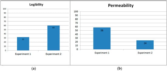 Experiments 1 and 2 outputs compared to the spatial analyses of parameters of (a) legibility; and (b) permeability (numbers refer to percentages of pixels with less than 10% difference).
