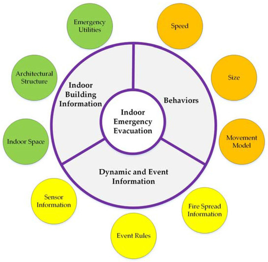 Indoor emergency evacuation is a very complex group behavior. Information about the distribution characteristics, behavioral characteristics, development of and changes in an evacuation environment, individual behaviors, dynamic changes, and the interaction among elements may exert important impacts on an actual evacuation process. A series of significant findings related to emergency response in various indoor emergency situations has been discussed [46,47,48]. Based on this research, during a building fire, critical indoor evacuation information that is required for situational awareness can be categorized into the three dimensions shown in Figure 1.