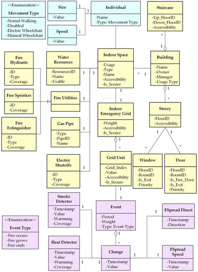 This section discusses the critical element requirements for indoor emergency evacuation and proposes a conceptual data model and unified modeling language (UML) class diagram for the DIFM. The comprehensive representation of an indoor dynamic environment could efficiently provide calculable emergency information to decision-makers and improve an individual’s navigation ability inside structures, as discussed in Section 4.