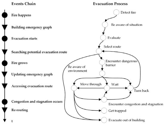 First, the process an individual uses to analyze evacuation routes and the flow of the change-based evacuation method must be determined. Based on related research studying human behaviors in response to fire [57,58,59], Figure 4 presents a diagram of individual behaviors during the evacuation process. The arrows in the evacuation process indicate the directions of evacuation flows. In a fire evacuation, an individual will adjust strategies to respond to the evolution of the environment. For example, with congestion and stagnation, an individual may wait or turn back and seek an alternative route. An individual’s evacuation strategy adjustment can balance the evacuation efficiency and predict potential congestion and stagnation during an evacuation. Consequently, the key steps during emergency response are summarized in the event chain shown on the left side of Figure 4.