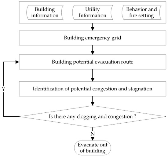 According to the event chain, the flow of a change-based evacuation method is shown in Figure 5. The input data include building information, utilities information, and behavior and fire settings, which can be modified according to the DIFM. The building emergency grid is based on the grid units of the extracted indoor space, including information associated with utilities and individuals. After obtaining the original grid set, a potential evacuation route for each individual can be calculated by applying a certain search algorithm (e.g., A* algorithm). As the fire grows, an individual’s evacuation route may intersect with a dangerous barrier, such as a fire or smoke barrier. Thus, the security of a potential route should be assessed when establishing each potential evacuation route. Furthermore, individuals must bypass congestion and stagnation where substantial numbers of people become trapped along the route. Thus, an individual can evacuate the building by selecting a reasonable and safe route.