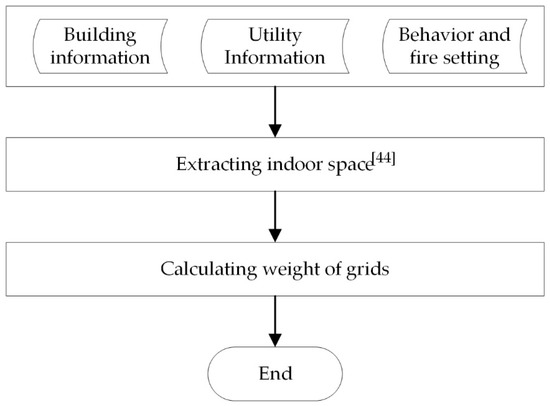 where a, b, c, and d are the ratios of the four weight components. Because, according to the site assessment, each one of these four aspects (utilities, detector, individual, and fire) is very important and may have the key influence during evacuation, in this paper, we assume the ratio of each aspect is the same. When is equal to 0.0, the related grid can be freely accessed. When is greater than 0.0, the grid can be safely accessed to help a trapped individual wait or establish a security zone. When is less than 0.0, the grid cannot be accessed by individuals.