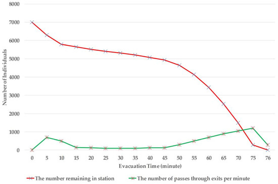 The statistical information collected during the evacuation is summarized in Figure 13. The remaining number of individuals is defined according to the time at which the last individual exits the station. The emergency response time is the total evacuation time of the building because all individuals had to leave the station via the four exits mentioned in Section 5.2. Evacuations of the three floors are parallel, and the evacuation time is primarily dependent on the spatial distribution; dynamic elements, such as the fire-affected distribution; and routing strategy. The potential congestion and stagnation around the key portals and exits may cause long delays in entering a staircase or exiting the building. As shown in Figure 13, from 10 min to 45 min after the fire started, the evacuation speed and pass speed significantly decreased because of congestion or stagnation.
