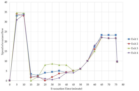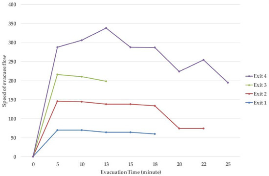As performed in the prior analysis, by counting the number of evacuees passing through each exit per minute, Figure 18 shows the statistical information regarding the speed of evacuee flow through the four exits. Because the node of the four exits did not consider the congestion situation and the shortest path algorithm sent the evacuee flow to the nearest exit, Exit 4 is the end of most nodes because of its location and the distribution of nodes throughout the 3D network. As a result, the evacuation takes approximately 25 min, and the speed of evacuees passing through each exit is not the same, which is also caused by the location of each exit and the distribution of nodes.