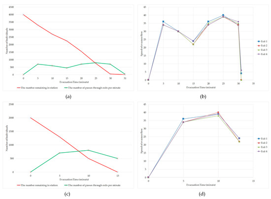 Evacuation analysis based on different number of individuals: (a) statistical information collected during the simulated evacuation based on 4000 individuals; (b) speed of evacuee passing through each exit in the station based on 4000 individuals; (c) statistical information collected during the simulated evacuation based on 2000 individuals; and (d) speed of evacuee passing through each exit in the station based on 2000 individuals.