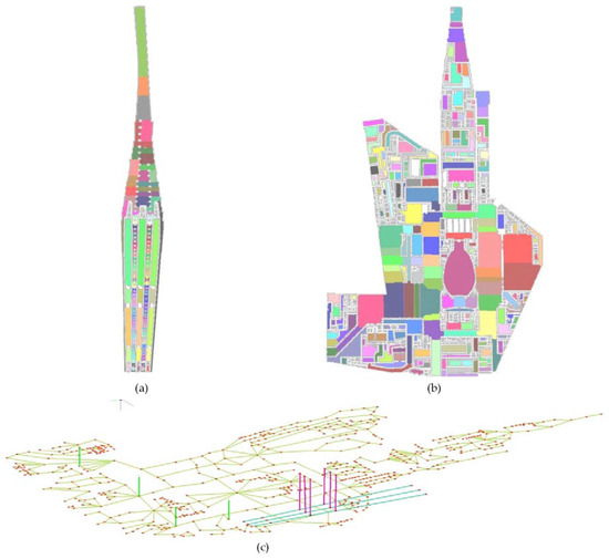 3D network of the experiment station data: (a) the region partition based on grids of Floor 1; (b) the region partition based on grids of Floor 2; and (c) the 3D network based on region partition of the station.