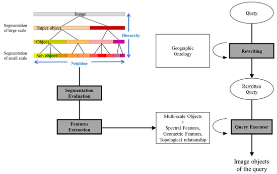 Here, our objective is to develop an ontology-based image object interpretation. This paper presents a novel method that combines multi-scaled segmented image objects with a geographic concept definition to express the context for better interpretation. The proposed approach is introduced in Section 2.1, Section 2.2, Section 2.3, Section 2.4 and Section 2.5. First, image segmentation work is performed using eCognition software, and the spectral features and geometric features of each segment are extracted. The hierarchical structure obtained from multi-scaled segmentation serves as the indirect expression of context. Besides spectral features, geometric features, and topological relationships are used. Ontology stores the geographic terms and their definitions in web ontology language–query language (OWL-QL). For efficiency, the match between concepts and objects is implemented by OWL-QL query-answering. Case studies utilizing this technique are illustrated in Section 3 along with results, assessment and discussion. Conclusions follow in Section 4.