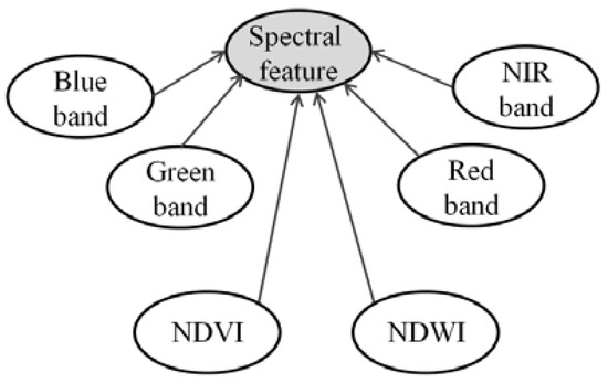 In this study, three types of features define the geographic concept: features of a single image object, features between two image objects, and context. We first consider the features of a single image object, such as spectral features, geometric features, and texture. They are usually regarded as attributes, including qualitative and quantitative values. Spectral features (Figure 2) are used to recognize substances (water, vegetation, soil or sealed ground) as inherited from pixel-based interpretation methods. Geometric features (Figure 3) can contribute to the interpretation of additional information. For example, water can be a pond, river or lake according to the size and shape [23]. Topological relationships are important spatial relationships between two image objects. Because image objects in a segmentation of the same scale are seamless and non-overlapping polygons, topological relationships are reduced to adjacency. Between the segmentations of different scales, topological relationships are adjacent, contained or within. Context is the key for further improvement of interpretation. The meaning of an object is not just from itself, but also from the surroundings. The topological relationships contribute to this context. As for context involving multiple image objects, we express it via the hierarchy within multi-scaled image objects.