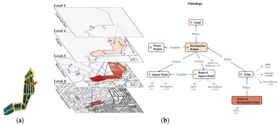 The cooperation between the concept definition and the multi-scaled image objects is illustrated in Figure 4. For instance, Figure 4a is an image object from the level 2 segmentation in Figure 4b. It represents a typical seaside reclamation region that has several artificial ponds with banks by the sea. Previous methods usually segment it in one scale (as the yellow line shows corresponding the level 3 segmentation in Figure 4b) and then use spectral features to classify water and bare land, along with geometric features to further identify water as ponds (area and shape index) and bare land as roads (shape index). However, the arrangement and combination of image objects showing regional features are ignored. Context is key for better interpretation. Considering the surroundings, roads beside the artificial ponds can be recognized as pond banks. Inside the region, the artificial ponds and banks account for most of the area, and can be identified as a region of cultivation ponds. The ponds and banks within the region have further interpretation as cultivation ponds and banks respectively.
