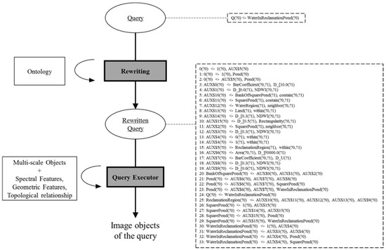 Some regard the reasoner as a special classifier, because of the ability to infer implicit knowledge. Reasoning is typically multi-exponential or even undecidable. Theoretically, a large number of conclusions are drawn from the ontology, but only some are needed in practice. In the case of remote sensing image interpretation from instances (image objects) to classes (geographic concepts), the large number of instances makes reasoning time consuming. OWL-QL, a sublanguage of OWL, supports query-answering within the ontology, and reasoning is performed in polynomial time [25] applied to the situation. Following the method of Krötzsch [25], there are three steps to complete the OWL-QL query-answering (Figure 5).