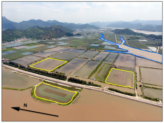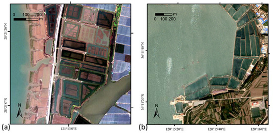 The two example image scenes, chosen for their prominent features and context, are composed mainly of water, bare land, mudflats, seaside reclamation, greenhouses, artificial structures, and fields. Seaside reclamation ponds are common in coastal areas, for various sea uses, such as aquaculture or bay salt. The reclamation ponds have prominent features. From the photo of District 1 shown in Figure 7, reclamation ponds are arranged neatly adjacent to the sea or river. Due to their shallow depth, mudflats or bare land appear in the middle or at the edge of the ponds. The banks of the reclamation ponds are composed of bare land, occasionally covered with vegetation.