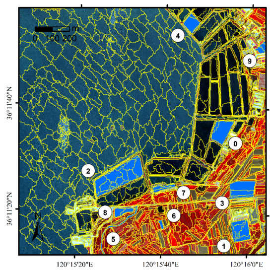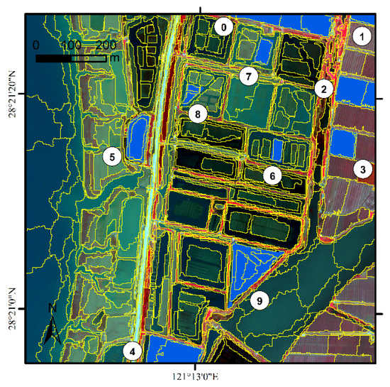 The supervised image segmentation assessment cannot represent the overall accuracy. Samples were selected to estimate segmentation quality by measuring the differences between the reference objects and the segmented objects. The bare land, greenhouse, water pond, vegetation, and mudflats are the objects of interest, so 10 reference objects were delineated for two images (Figure 10 and Figure 11). The difference indices of quantity, area, and position (defined in Section 2.2) were calculated. There are some similarities in the two segmentation assessment results (Table 2 and Table 3); all values of I are more than 0.5, and most values for OL are zero. The number of invading objects accounts for most of this result, and there are a few good objects. However, the low values of OE and CE show that the segmentation error is small and slightly over-segmented as a whole (all values of AFI are lower and higher than zero). This situation may be caused by the delineation of the reference objects. The object boundaries are presented by gradual mixing pixels so that precise delineation decisions are rare. The segmentation result is optimal when both ADIoverall and PDIoverall are at the minimum simultaneously [28]. This means the areas of commission and omission are small and the matched image objects are close to the reference image object. However, such a case rarely occurs. Area discrepancy information is more important than position discrepancy information for segmentation assessment [28]. The values of the two regions’ ADIoverall are 0.05 and 0.08. The segmentation result is valid and can be used for the subsequent process.