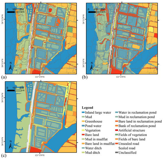 Case 2: (a) interpretation using proposed method; (b) interpretation using supervised classification; (c) reference interpretation.