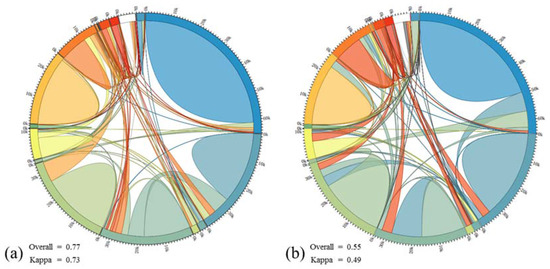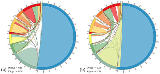 Chord diagram of the error matrix in Case 2: (a) between the reference and interpretation of the proposed method, (b) between the reference and interpretation of the supervised classification (the legend in the diagram is the same as in Figure 14).