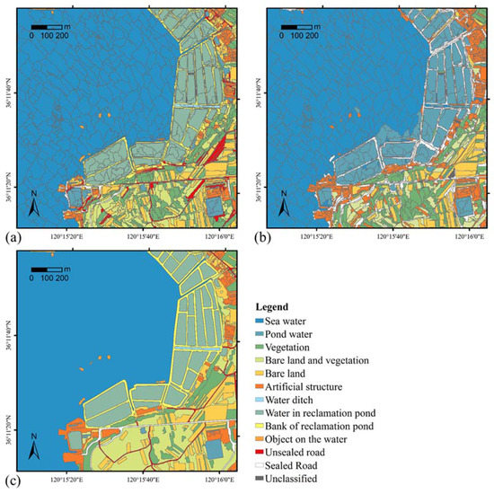 The study started with image segmentation producing image objects on four scales. The commercial software eCognition conducted the multiresolution segmentation algorithm with four sets of parameters differing in scale. The choice of parameters depends on the four-scaled objects of interest: regions of sea and land (Figure 8a and Figure 9a); large regions, such as water, mudflats, reclamation, and fields (Figure 8b and Figure 9b); basic geographic objects of interest (Figure 8c and Figure 9c); and over-segmented image objects for refined classification (Figure 8d and Figure 9d). The image objects of the smallest scale can be regarded as the final classification units. Therefore, the image objects of Figure 8d and Figure 9d were put into the supervised assessment of image segmentation.