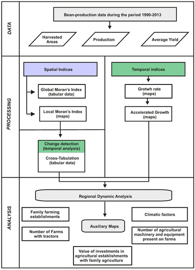 The digital processing of the agricultural production data of the bean was subdivided into two approaches of regional analysis, considering spatial and temporal metrics (Figure 1). In the first approach was performed a spatial analysis of the municipalities with their neighbors from the spatial autocorrelation using the Moran Global and Local index. In addition, a change detection analysis from the cross tabulation was performed on the time series of Moran Local indices. This procedure allows numerically show the changes in bean production variables over time.