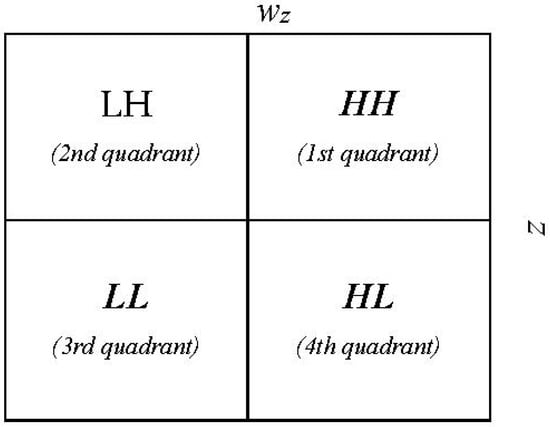 The Moran scatterplot shows the spatial dependence, where the coefficient Moran I is the slope of the regression curve between “wz” and “z” [14,24]. This scatterplot consists of four quadrants: High-High (HH), High-Low (HL), Low-High (LH), and Low-Low (LL), where each quadrant corresponds to a degree of spatial association between a given area and its neighbors, according to weighting matrix (Figure 2).