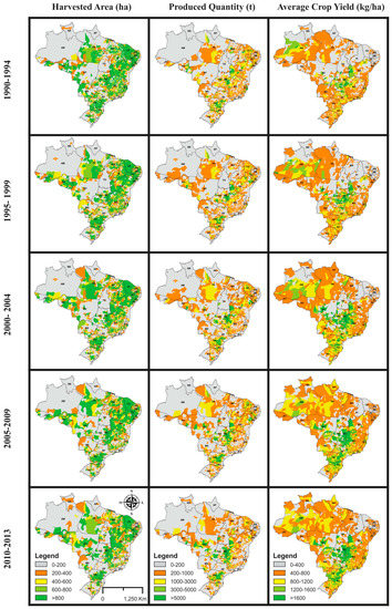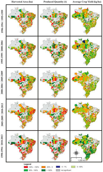 The produced quantity increased in most municipalities, mainly in the following states: AM, MT, MS, RR, PA, MA PI, BA, MG, GO, FD, and PR. Stagnant production areas concentrated in the West Central Region (MT and GO), North region (AM and PA), as well as TO and SP. Municipalities with area reduction for all periods are spread over several states, highlighting located in the Southeast and Northeast regions.