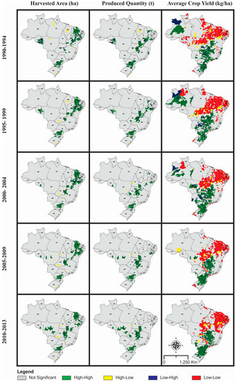 The average crop yield variable increased HH class from 935 municipalities (1990–1994) to 1127 municipalities (2010–2013). HL class changed between the two periods of 54 to 58 municipalities, while LH class from 215 to 79 municipalities. The number of municipalities that did not fit in any group was 3358 (1990 to 1994) and 2958 (2010–2013), i.e., a reduction of approximately 12%.