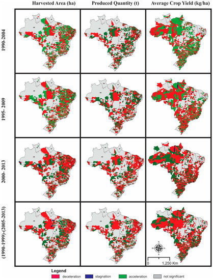 Figure 6 shows the AG maps to the bean variables in the studied periods, including the comparison between 1990–1999 and 2005–2013. The accelerated rate of harvested area was intense in the following states of MT, MA, PI, GO, TO and BA (Barreiras and Luís Eduardo Magalhães). The invariant municipalities in the studied periods concentrated largely in MT, TO, GO, SP, and MG.