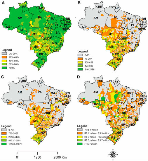 Figure 8B,C show regionally the presence of agricultural equipment in the establishments, indicating the presence of a larger technological apparatus and an improvement in productivity. These attributes show a higher concentration in the Southeast, Center-West, and Southern regions of Brazil, which contrasts with the North and Northeast regions. In the Northeast region, the Western Bahia presents a distinct behavior due to the development of agribusiness that uses highly intensive farming systems [37,38]).