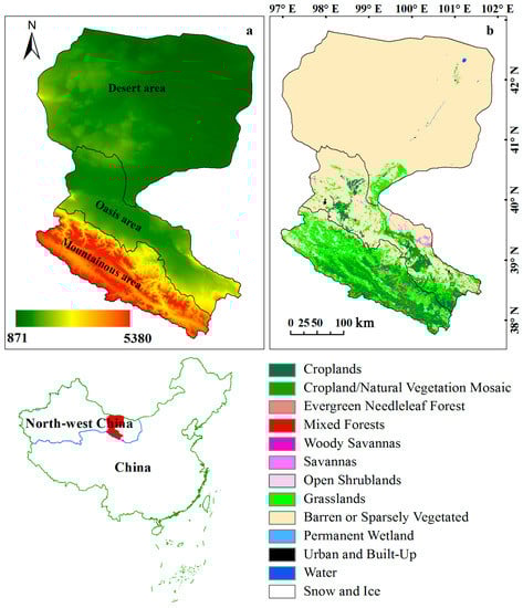 Northwest China contains most of the world’s mountain-basin terrain. Due to this special topography, snow and glacier melt and precipitation [25] in mountainous areas are the primary sources of water for lakes and inland basins in mountain-basin systems. This limited water promotes the development of relatively high-productivity oasis systems between the mountains and basins. The HRB is the second-largest inland river basin in China. It ranges between longitude 97.02°–102° E, and latitude 37.12°–42.12° N. Its approximate area is 143,000 km2. It was selected as our study area because it contains the special MODS and is a microcosm of the terrain and climate of mountain-basin landscapes in Northwest China. Based on the elevation differences within these regions and the importance of oases, the HRB’s mountain-basin landscapes can be divided into three regions: an upper mountainous area, a middle oasis area, and a lower terminal arid desert area around Ejin Banner (see Figure 1a) [26], with the elevation in these three regions ranging from 5380–2000 m, 1700–1300 m, and 1450–871 m above sea level, respectively (see Figure 1a) [27]. There are obvious climatic differences between the upper and lower regions, resulting in diverse landscapes that include glaciers, forests, irrigated crops, and the Gobi desert [28].