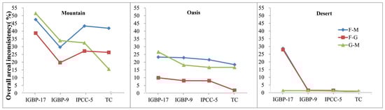 The FROM-GLC and GlobCover 2009 comparison had the smallest overall areal inconsistency in mountainous and oasis areas using the four common classification systems, with values less than 38.76%, 19.71%, 8.10%, 1.58%, and 9.95%, 8.10%, 8.05%, 1.85%, respectively. In desert areas, the GlobCover 2009 and MODISLC comparison had the smallest overall areal inconsistency, with values of 1.36%, 1.31%, 1.23% and 1.07% using the four common classification systems.