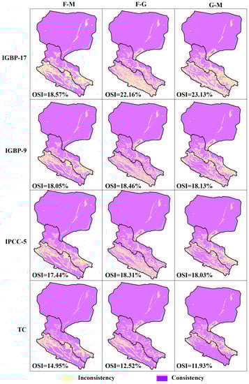 Overall spatial inconsistencies (OSI) and the distribution thereof in mountain-oasis-desert system in the pairwise comparison of the FROM-GLC, GlobCover 2009 and MODISLC datasets in the four common classification systems (F-M: areal inconsistencies in the comparison between the FROM-GLC and MODISLC datasets; F-G: areal inconsistencies between the FROM-GLC and GlobCover 2009 datasets; G-M: areal inconsistencies in the comparison between the GlobCover 2009 and MODISLC datasets).