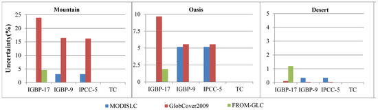 During the classification system conversion to IGBP-17, IGBP-9 and IPCC-5, the GlobCover 2009 dataset had the relative largest uncertainties due to too much class definition using mosaic, and the FROM-GLC dataset had the smallest inconsistency of the three systems due to its clear classification scheme (see Figure 4). In mountainous areas, the classification system conversion uncertainties of the GlobCover 2009 were 23.9%, 16.47% and 16.2% using the three common classification systems, those of the MODISLC were 0%, 3.08% and 3.08%, and the uncertainties in the FROM_GLC dataset conversion were 4.58%, 0% and 0%. In oasis areas, the classification system conversion uncertainties of the GlobCover 2009 dataset using the three common classification systems were 9.68%, 5.57% and 5.56%, those of the MODISLC dataset were 0%, 5.17% and 5.17%, and the uncertainties of FROM_GLC dataset were 1.89%, 0% and 0%. In desert areas, the classification system conversion uncertainties of the GlobCover 2009 dataset using the three common classification systems were 0.11%, 0.05% and 0.05%, those of the MODISLC dataset were 0%, 0.34% and 0.34%, and the uncertainties of FROM_GLC were 1.2%, 0% and 0%. The reason why the FROM-GLC had the smallest classification system conversion uncertainties among the three datasets is that it uses the hierarchical classification scheme, in which explicit attribution of land cover types is implied from the second level to the first, reducing the uncertainties. Therefore, we suggest that hierarchical classification schemes should be used in the production of landcover mapping.