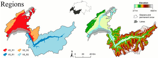 Study area and modelled regions: canton of Vaud bellow 900 m a.s.l. (VD_R1), canton of Vaud above 900 m a.s.l. (VD_R2), canton of Valais bellow 900 m a.s.l. (VS_R1) and canton of Valais above 900 m a.s.l. (VS_R2).