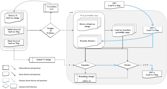 Flow chart illustrating the land use/cover change Dinamica Environment for Geoprocessing Objects (EGO) modelling framework.