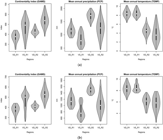 The calibration of each model was executed for a time span of 12 years from 1997 to 2009. First, we determine the number of transitions being modelled in addition to the transitions that describe each scenario (Table 3). For this study we selected to model 15, 11, 15 and 17 transitions for VD_R1, VS_R1, VD_R2, and VS_R2, respectively (Tables S1–S4). The second step is to study how each variable can impact the changes in the landscape we compared to the distribution of the driving forces in each region (Tables S1–S4). Figure 3 shows the results obtained with different driving forces, for the transitions open forest to forest and intensive agriculture to open forest, in the form of violin plots. Significant differences are observed in the frequency distributions of the driving forces for each region, except for the mean annual temperature, which shows similarities between regions at the same altitude range. This finding implies that transitions are influenced by different ranges of the driving forces in each region. The continentality index distribution has similar median values for the regions with the same canton, while the range of values varies between each region belonging to the same canton. While both mean annual precipitation values show considerable variation in each region, the mean annual temperature has similar results for regions in the same elevation band. This finding implies that the separation of the study area into four regions according to an elevation threshold of 900 m a.s.l. and the administrative region (cantons of Vaud and Valais), will allow the development of better land use models.