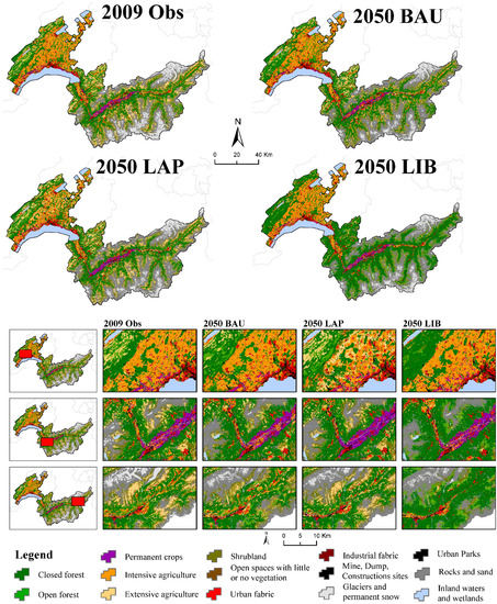 The quantification of land use change for the BAU scenario is based on the observed changes between 1997 and 2009. BAU is obtained directly from the observed yearly rate of change in a 12-year period, applied as the yearly rate of change for a 41-year period (between 2009 and 2050). The quantification of both LAP and LIB scenarios were based on the observed yearly rates of change between 1997 and 2009, and by taking into consideration the definition and magnitude of change described by Bolliger et al. [13] for the transitions between forest, open forest, shrubland, and intensive and extensive agriculture. Other transitions observed in the past but not modelled by Bolliger et al. [13] were kept with the same rate of change as the one observed between 1997 and 2009.