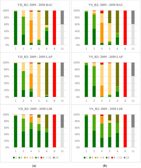 Percentage of land use composition in 2050 (BAU, LAP and LIB scenarios) out of the existent in 2009, in (a) VD_R2 and (b) VS_R2. Each stacked bar represents the share of land use type in 2050 (BAU, LAP and LIB scenarios) for each land use types observed in 2009. Colours indicate each land use type. The stacked bar percentage information was obtained by cross-tabulation between the observed 2009 and each land use scenario. 1: closed forest; 2: open forest; 4: intensive agriculture; 5: extensive agriculture; 6: shrubland; 8: urban; 11: glaciers and permanent snow; 13: rocks and sand.