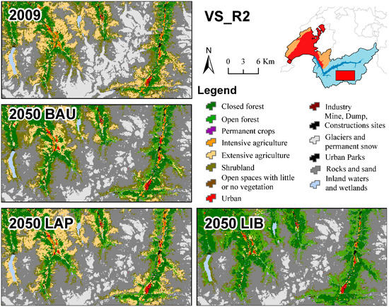 The results obtained for the different regions in each scenario show significant differences, with the LIB scenario being the one with the highest impact. The BAU scenario results in a considerable change in the landscape across regions, however compared to LAP, which is otherwise similar, these changes have less impact on the landscape. The LAP scenario suggests an increase of the overall proportion of extensive agriculture from 9.0%, in the BAU scenario to 15.5%, in the LAP scenario (Table 6). Such changes will increase the potential for habitat areas [13,14,15], however, it could accelerate soil erosion, mostly at high altitudes according to previous studies [6,7]. The marked increase in forest cover from the LIB scenario in association with the glaciers and permanent snow loss of ~40%, is expected to decrease the amount of runoff resulting in a clear impact on the quantity and quality of water [11,12,13,52,53]. According to [16] the increase of forest area along with the increase of temperature, will most probably raise the occurrences of fires in the regions located in Valais. Although the loss of extensive agriculture is also expected to be a threat to animal and plant species [13,14,15] , different studies suggest that extensive agriculture abandonment could allow the implementation of landscape planning strategies at lower costs [54,55]. Although care must be taken when using scenarios due to limitations on the explanatory power of the driving forces [28,31,34], as well as changes in government legislation and land management that impact land use change. However, scenarios of land use/land cover change offer the possibility to evaluate potential impacts and improve planning [2,5].