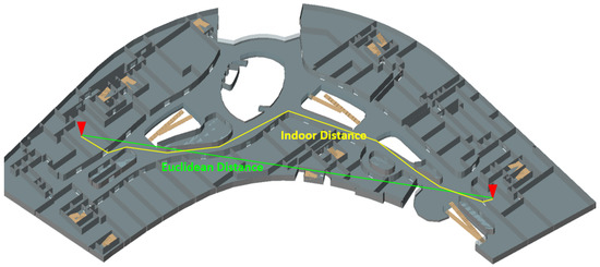 Indoor space composed of a number of architectural components, such as rooms, corridors, floors, wings and elevators, has more complicated structures than outdoor space. In order to compute the distance between two points in indoor space, we therefore have to consider the architectural structure, more precisely two factors: architectural components, such as walls, doors, stairs, etc., and the connectivity between indoor spaces, as shown in Figure 1. This means the information about indoor connectivity and architectural components is necessary to compute indoor distance. First, the indoor connectivity, called the indoor accessibility graph [13,23], has to be prepared, as we need a road network graph to compute distance on the road network. An indoor accessibility graph is represented as , where a node is a room or a space unit in indoor space and an edge represents the connectivity between two adjacent space units, for example via the door. The edge may contain any additional attributes such as the length of the connection.