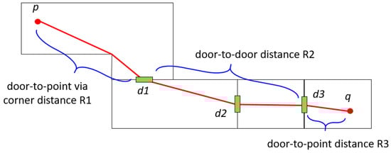 However, a simple edge connecting two nodes does not fully reflect the distance information particularly when the room connected to the edge has a big area or complicated geometry [24]. In order to overcome this problem, we need the geometry information of the room or space unit surrounded by architectural components, such as walls and doors. Once indoor geometry information is provided, the indoor distance is computed by dividing the total path into point-to-door and door-to-door distances as illustrated in Figure 2. In this figure, the path from point p to point q is divided into several sub-paths; the first sub-path from p to door , the second from to door and the third path from to q. While the distances from p to and from to q are called point-to-door distance, the distance from to door is called door-to-door distance. The point-to-door distance may be computed by line-of-sight [12] or the Minkowski sum [24], while the door-to-door distance can be easily computed by the shortest path algorithm with pre-computed door-to-door graph [12].