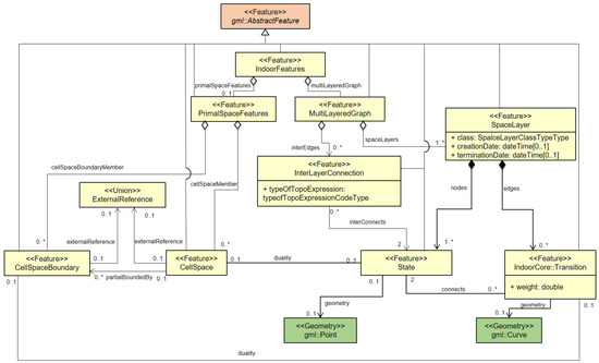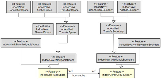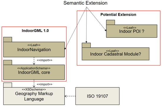 For the sake of extensibility, IndoorGML has a modular structure as shown in Figure 8. The core module of IndoorGML contains the data model for cell geometry, topology and the multi-layered space model. The indoor navigation extension model, which provides the semantic extension model for indoor navigation, is so far the only extension module defined on the top of the core model. Many other extension modules may be defined depending on applications. For example, the indoor cadastral model is a candidate extension of IndoorGML [30].