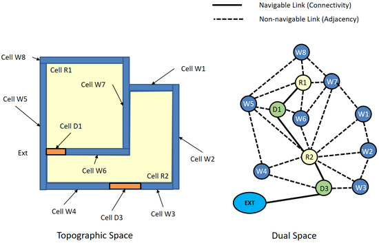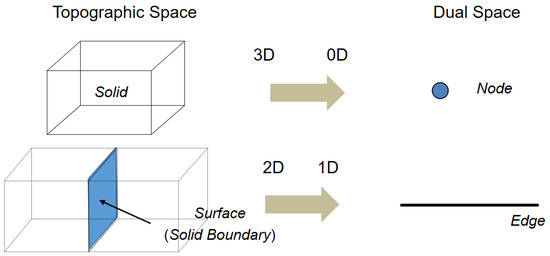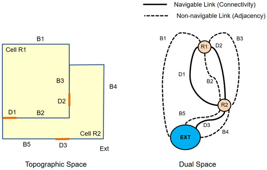Once cells are determined with their identifiers and geometric properties, we need to describe the topological relationship between cells, which is essential to most of the indoor navigation applications. The topology between cells in IndoorGML is basically derived from topographic layout of indoor space by Poincaré duality [27]. As illustrated in Figure 4, a k-dimensional object in the N-dimensional topographic space is mapped to a -dimensional object in the dual space.