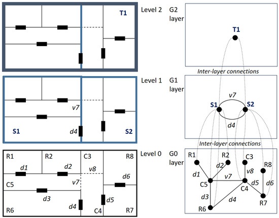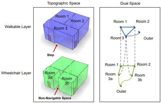 As briefly mentioned in Section 3.4, the same indoor space can be interpreted and represented in different ways. In IndoorGML, a mechanism, called the multi-layered space model is offered to represent an indoor space by overlaying different interpretations [4,29]. Each interpretation corresponds to a cellular space layer with its own geometric and topological properties. For example, there are two different layer configurations of an indoor space due to a step in Room 3, as shown in Figure 7; the walkable layer and wheelchair layer.
