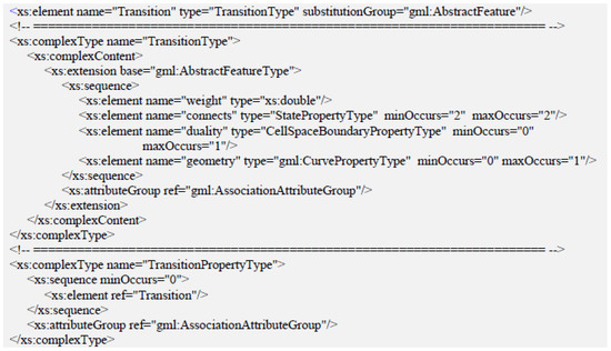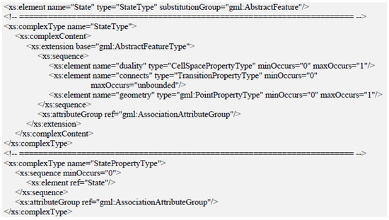 Since IndoorGML provides not only a standard indoor spatial data model, but also a format for data exchange, it defines an application XML schema based on GML 3.2.1 in addition to the UML class diagram. The UML class diagram in Figure 3 is therefore expressed in a XML schema, which defines the structure of XML data for IndooGML. The XML schema for the IndoorGML core module includes four basic types: State, Transition, CellSpace and CellSpaceBoundary. While CellSpace and CellSpaceBoundary belong to the basic units of the indoor primal space; State and Transition correspond to CellSpace and CellSpaceBoundary of the dual space for the connectivity topology of indoor cellular space. The schemas are given in Figure 9, Figure 10, Figure 11 and Figure 12, respectively.