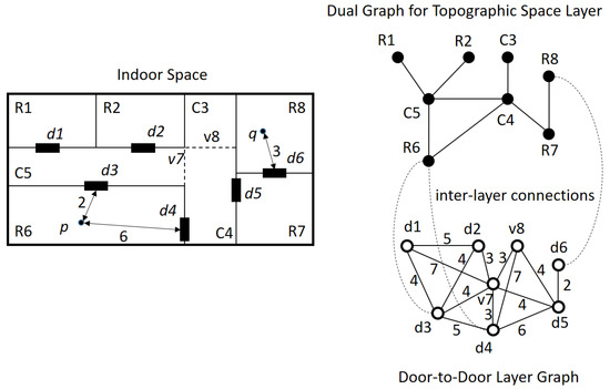 In Line 1 and Line 2 of the algorithm, we find the cells containing p and q, which are R6 and R8, respectively, in Figure 16, using the cell geometry data in the topographic layer. The doors of R6 and R8 are found as and from the inter-layer connections of the multi-layered space model in IndoorGML in Lines 3 and 4. Then, we compute the door-to-point distances from p and q to each door in and respectively using the cell geometry of IndoorGML for Lines 5 and 6. The door-to-point distance within a cell can be computed by the shortest path in a polygon algorithm in computation time where n is the number of vertices in the cell [36]. Then the results are and . We also compute the door-to-door shortest paths connecting and using the door-to-door layer graph in Line 7. Two shortest paths are obtained from the door-to-door layer graph: and , where and . Then, the horizontal distance is the sum of the door-to-point distance and door-to-door distances in Line 8, and the route with the minimum distance is ; and its distance while the distance of the alternate route is 17. We can also compute the horizontal indoor distance with the thick-door model in the same way.